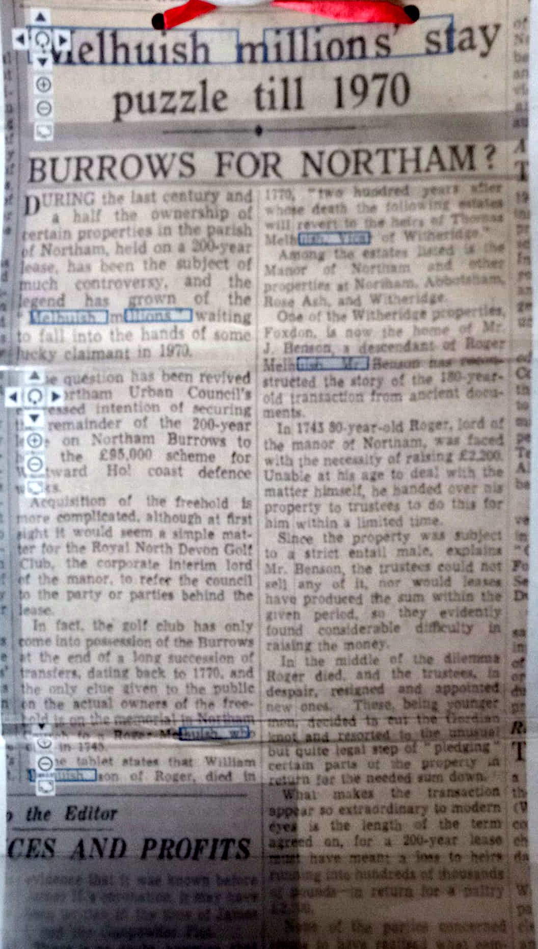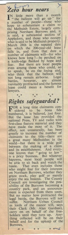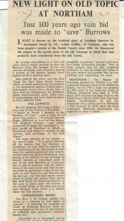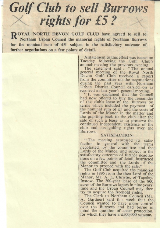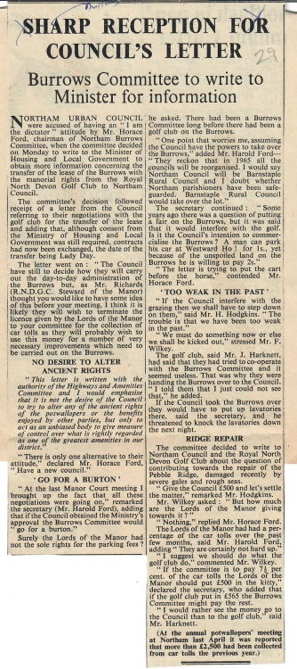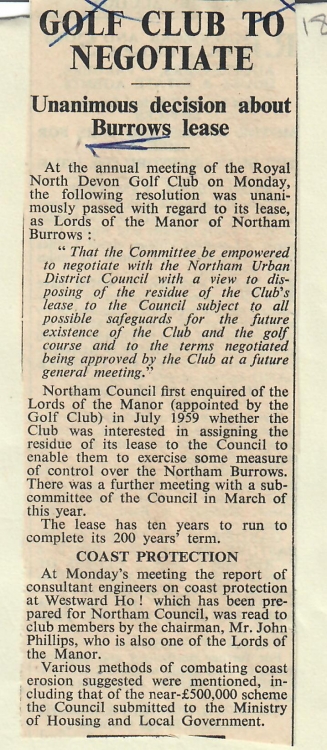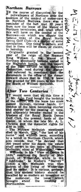 Northam Burrows News ArticleInevitably the land had passed through many hands during the intervening two centuries and estates had been broken into smaller parcels and sold on. There had been a great deal of development including much of the town of Appledore and the seaside resort of Westward Ho! In 1895 the lordship of the manor had been acquired by the Royal North Devon Golf Club and their golf course occupied the Northam Burrows. If all of the leased estate was to be claimed by the heirs of Thomas Melhuish in 1970, a lot of people were going to worry about the impact on their properties. This was first highlighted at a meeting of the potwallopers of Northam as can be seen in the adjoining newspaper article from the Western Morning News dated 22 Oct 1938.