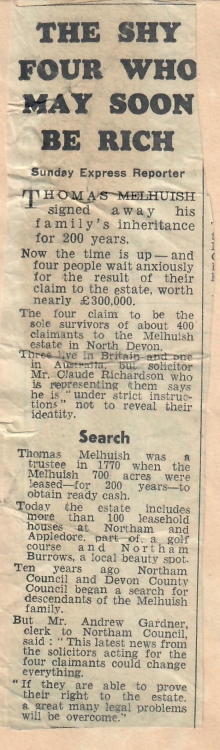 The story goes back to the mid-18th century when Roger Melhuish Esq owned Northam Manor and a great deal of land around Northam and Witheridge. In order to raise money, Roger disposed of Northam Manor and a great deal of other property on a  lease to run for 200 years from the death of his son William. As his son died in 1770, the lease expired in 1970, and this is the "Appledore estate". The property included a great deal of the centre of the old town of Appledore. At that time the properties should have reverted to the heirs of his other son Thomas, vicar of Witheridge. There is a memorial tablet in Northam church commemorating the lease and giving some details.